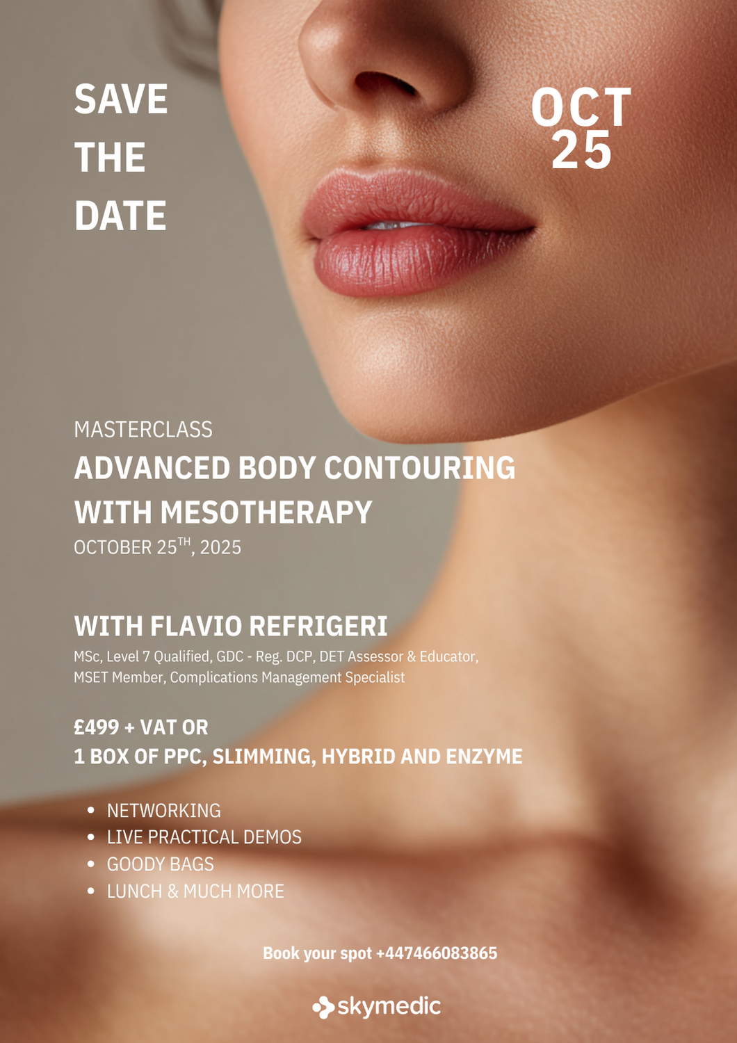 Take your body contouring treatments to the next level with this exclusive hands-on masterclass led by Flavio Refrigeri — MSc, Level 7 Qualified, GDC & JCCP Registered, Clinical Nurse, Advanced Aesthetics Injector, Complications Management Specialist, and Level 5 DET Educator & Assessor.