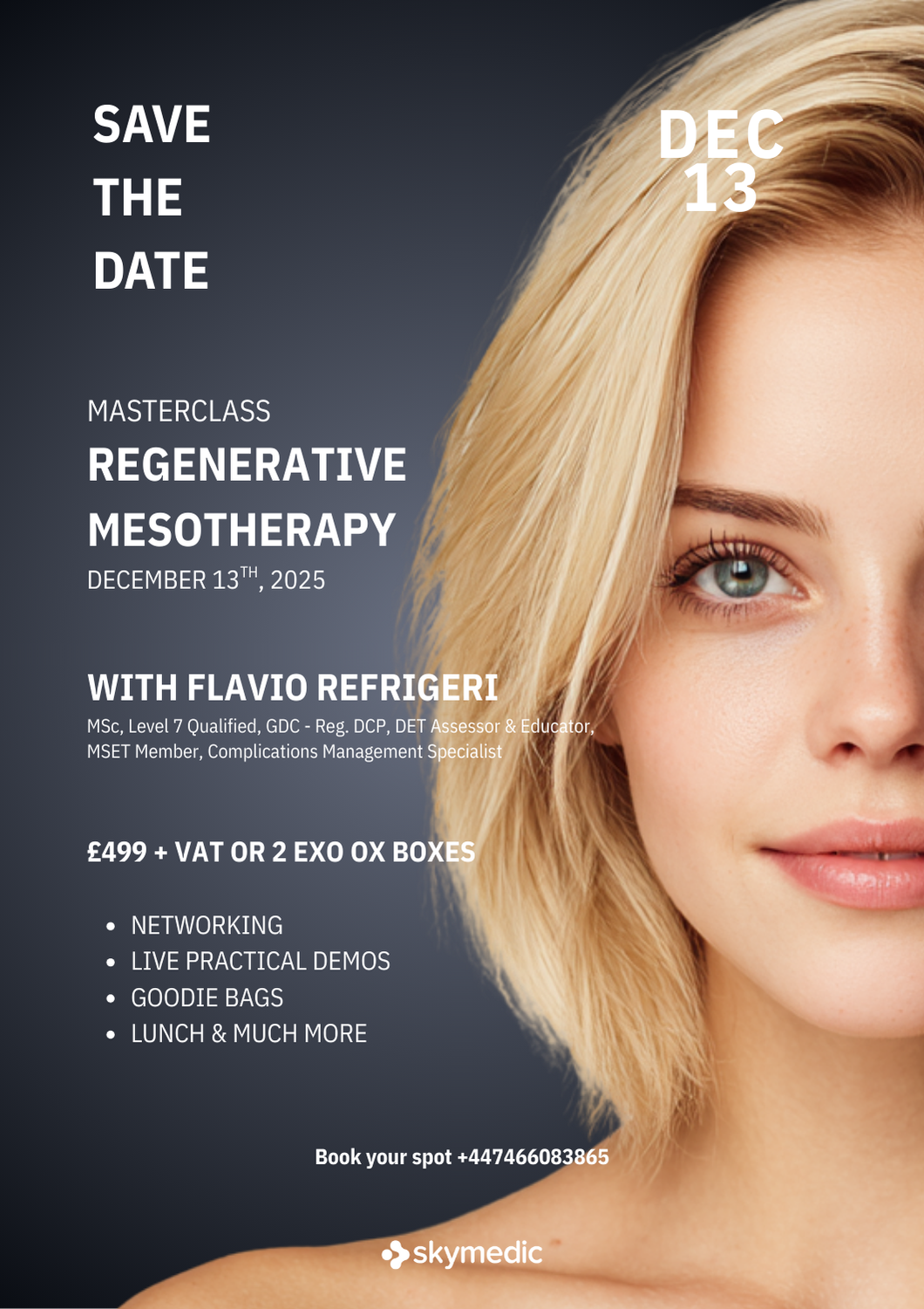 Join Flavio Refrigeri — MSc, Level 7 Qualified, GDC & JCCP Registered, Clinical Nurse, Advanced Aesthetics Injector, Complications Management Specialist, and Level 5 DET Educator & Assessor — for an intensive one-day masterclass dedicated to Regenerative Mesotherapy.